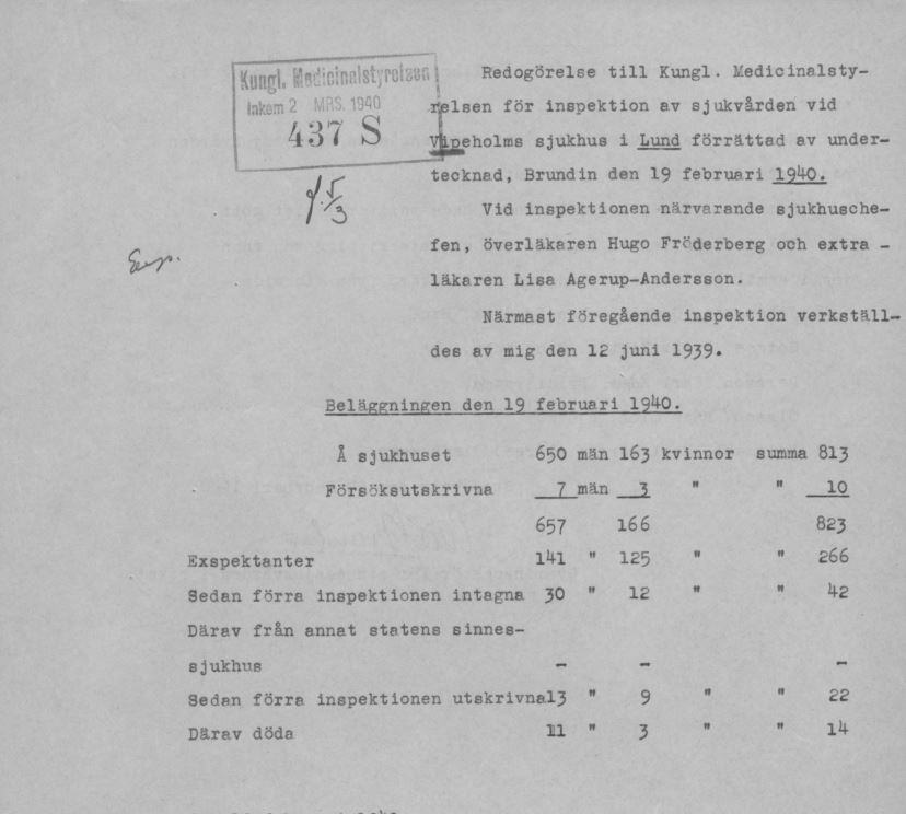 Dokumentet på den här sidan är en redogörelse av sjukvården vid Vipeholms sjukhus och bygger på en inspektion som genomfördes av Kungliga medicinalstyrelsen år 1940.