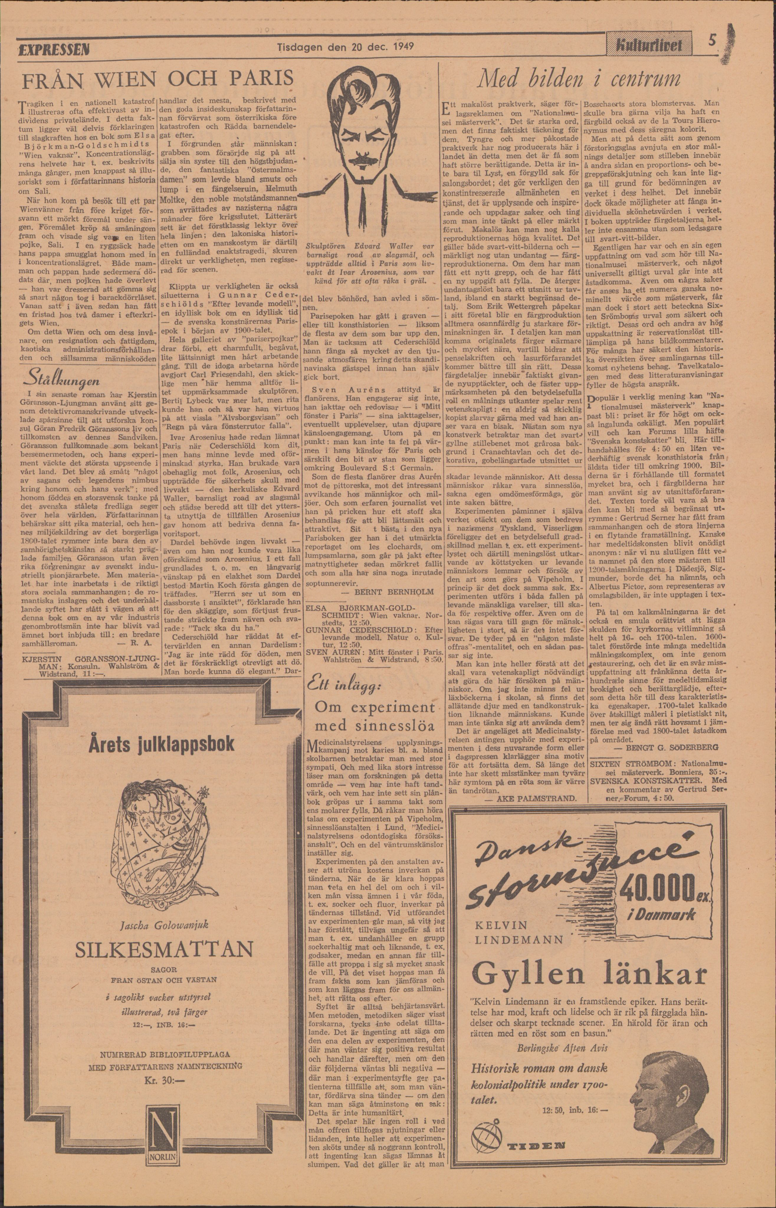 På den här sidan hittar du en tidningsartikel publicerad i kvällstidningen Expressens kultursida 20 december 1949. Inlägget är skrivet av Åke Palmstrand.